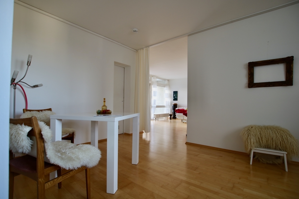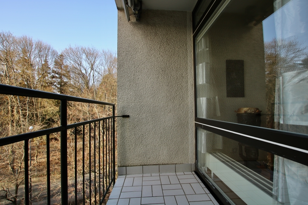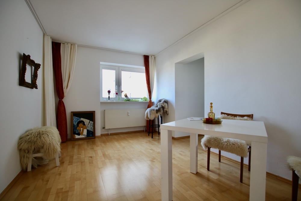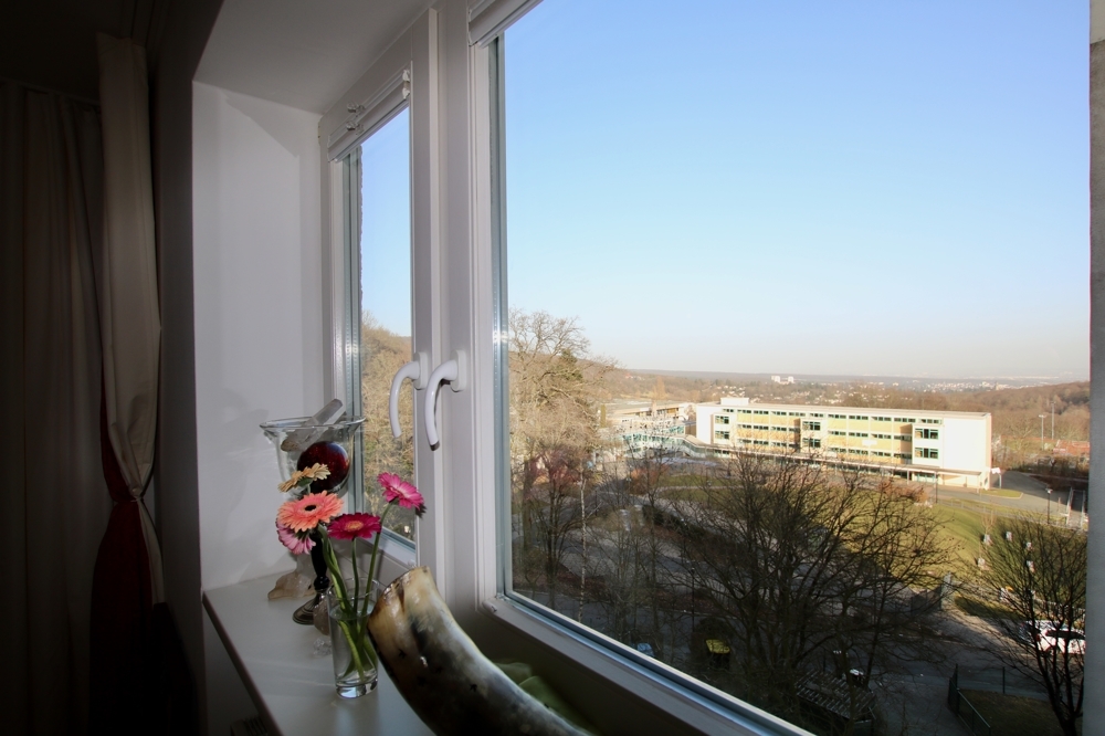 Gepflegt und gehegt wurde diese Wohnung von ihren Eigentümern. Immer wieder haben sie investiert, optimiert und verschönert. Dem Besucher bietet sich eine helle und freundliche 2-Zimmer-Wohnung, die mit viel Geschmack eingerichtet worden ist und die so viel Wärme ausstrahlt, dass man am liebsten bleiben möchte. Die Wohnung befindet sich in einer der oberen Etagen eines mehrstöckigen Gebäudes in Königstein. Vom Balkon in nordwestlicher Richtung blickt man ins Grüne hin zur Villa Rothschild und zur Königsteiner Burg. Von Küche und Esszimmer kann man weit ins Land hinüber nach Frankfurt schauen.Die Küche auf kleinem Raum ist praktisch und durchdacht geplant worden. Es gibt sogar einen kleinen Tisch zum Aufklappen. Das Badezimmer mit kleinen Mosaikfliesen an den Wänden verfügt über eine Badewanne mit Duschmöglichkeit. Es gibt in der Wohnung auch einen kleinen Abstellraum. In der gesamten Wohnung liegt Parkettboden. Der großzügige Wohn- und Essbereich ließe sich bei Bedarf gut in zwei abgeschlossene Räume unterteilen.