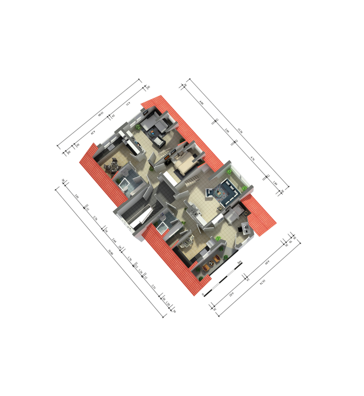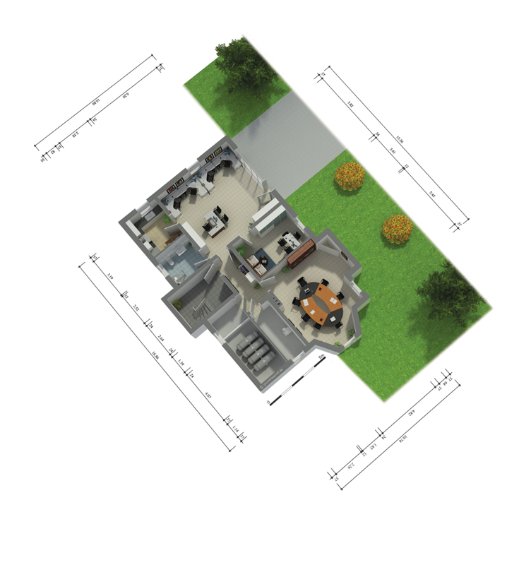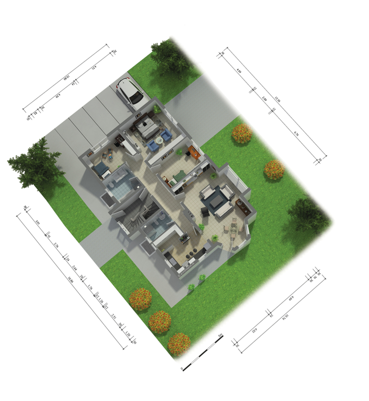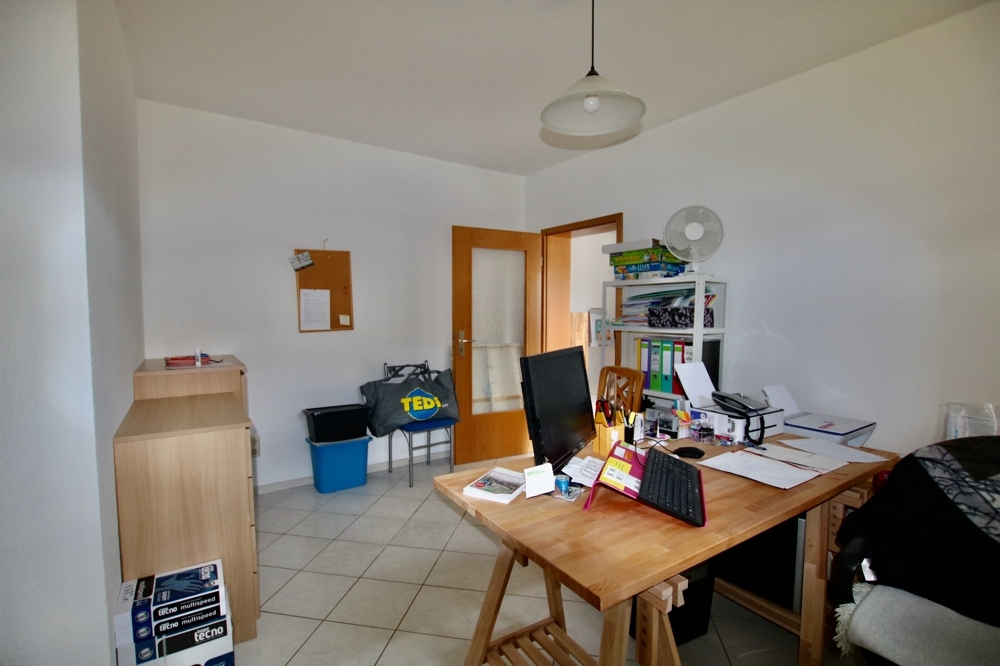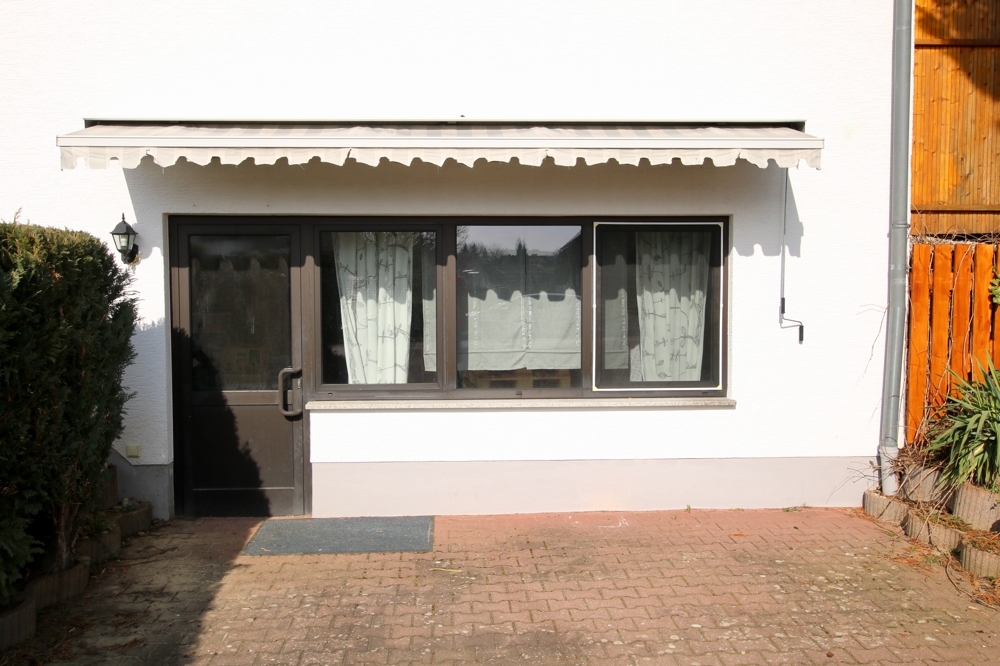 Im Kellergeschoss befindet sich eine 3-Zimmer-Einliegerwohnung mit Küche und Badezimmer. Wer diese Fläche nicht zum Wohnen nutzen will, kann sich hier ein großzügiges Büro einrichten wie auf dem Grundrissplan dargestellt. Der größere Raum verfügt über eine 5m-Fensterfront und Zugang nach draußen. Der davor liegende Außenbereich eignet sich für den Aufenthalt während der Pausen. Er kann mit einer Markise beschattet werden.