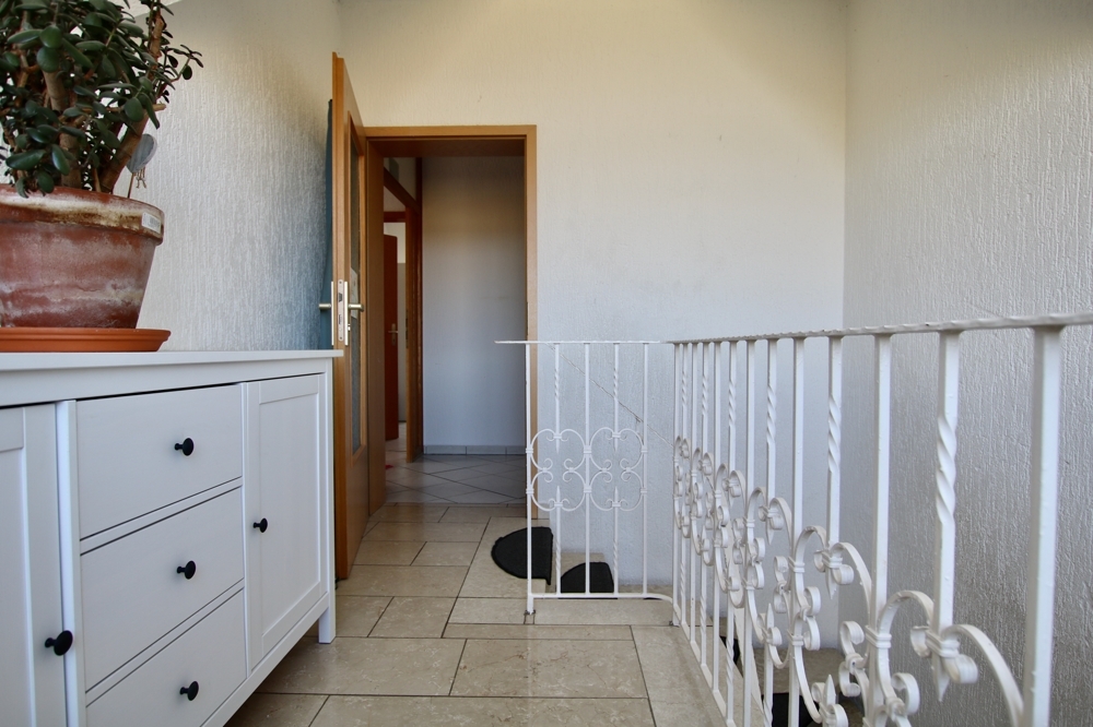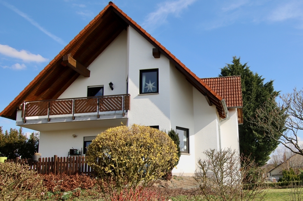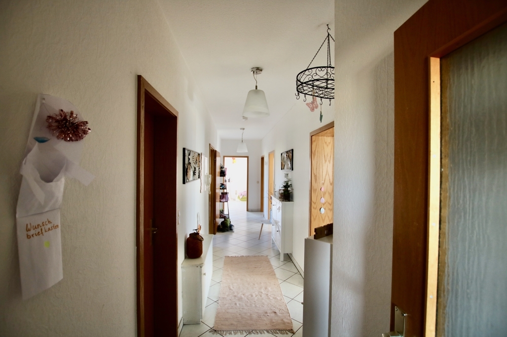 Das Haus mit hübschen Erkerelementen ist in einem gepflegten Zustand. Es wurde durchdacht und mit viel Geschmack und Liebe zum Detail geplant. Im Erdgeschoss, welches man von Nordosten betritt, befinden sich ein geräumiges Wohn- und Esszimmer mit Austritt auf die Terrasse in reiner Südlage, ein Schlaf- sowie zwei Kinderzimmer, die Küche mit voll eingerichteter Einbauküche und zusätzlicher angrenzender Speisekammer, ein Tageslicht-Badezimmer mit Badewanne und Dusche sowie ein Tageslicht-Gäste-WC mit Dusche.