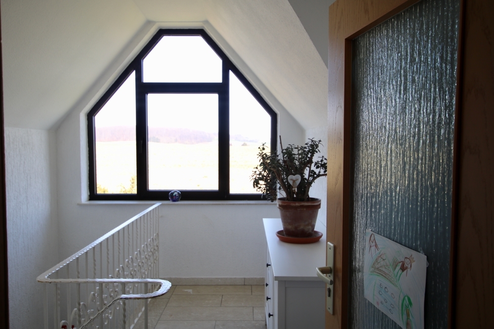 Das Haus hat hochwertige Fenster aus wartungsfreiem, braun eloxiertem Aluminium und Eichen-Innentüren. In allen Geschossen liegen Fliesen sowie Naturstein im gesamten Treppenhaus.