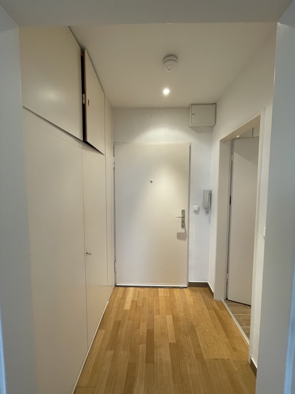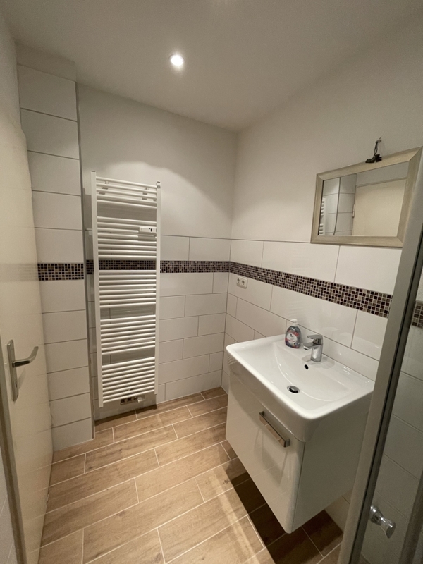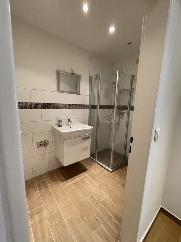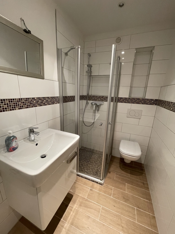 Das Badezimmer wurde aufwendig renoviert mit Mosaik-Bordüre und einer bodentiefen Duschkabine. Im Flur befindet sich ein großzügiger Einbauschrank, der sowohl als Garderobe und Stauraum genutzt werden kann.