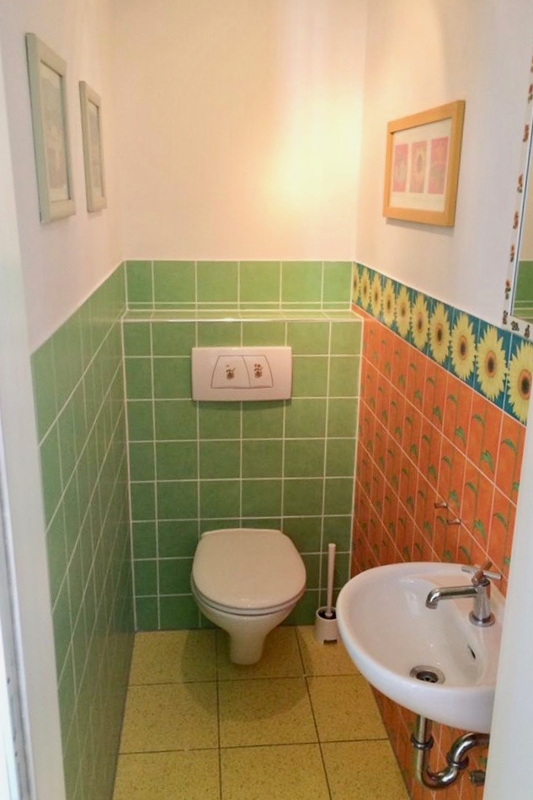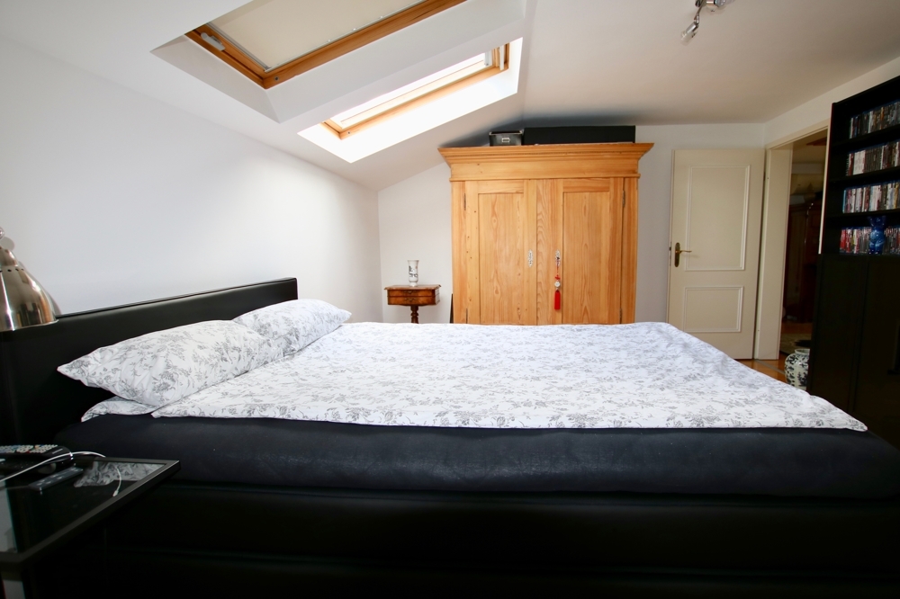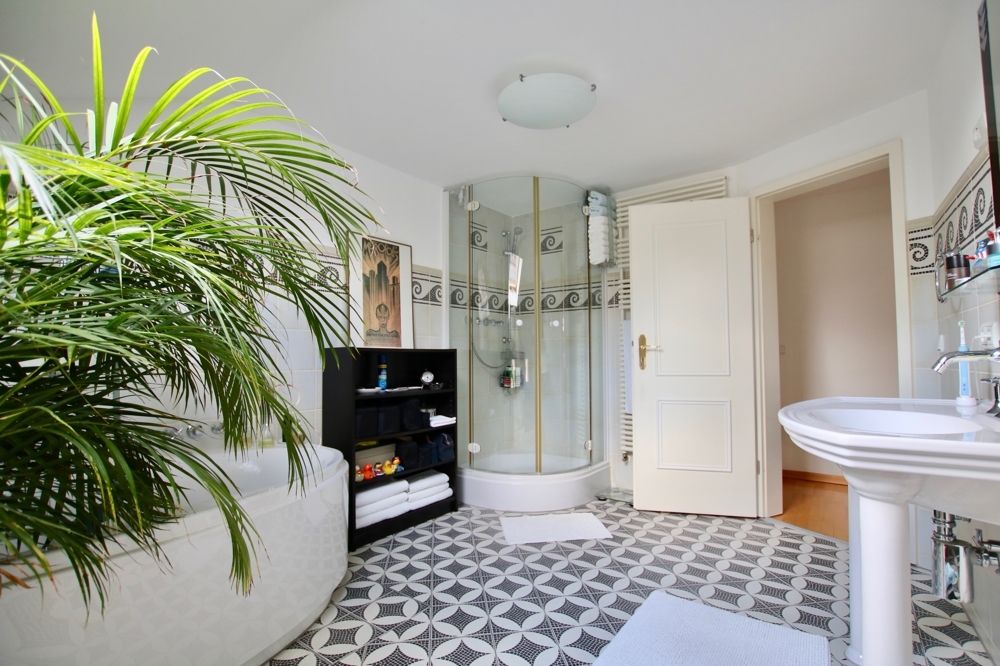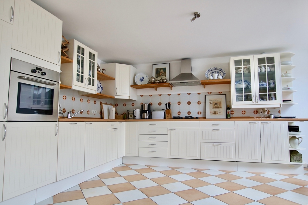 Vom Wohnbereich aus kann gelangt man in die geräumige Wohnküche im Landhausstil. Hier kann man bequem einen großen Esstisch stellen. Die hochwertige Einbauküche in einem cremefarbenen Ton und die weißen und terracottafarbenen Bodenfliesen verleihen dem Raum einen mediterranen Charme. Die Wohnung besitzt ein helles Tageslicht-Masterbad mit Dusche und Badewanne, das aufgrund seiner Größe und der Mosaikfliesen auf dem Boden und an den Wänden eine besonders wohnliche Ausstrahlung hat, fast schon wie ein römisches Badehaus. Es gibt zusätzlich ein separates, sehr geschmackvoll eingerichtetes Gäste-WC. Die Wohnung verfügt über ein großes Master-Schlafzimmer und ein weiteres Gäste-, Arbeits- oder Kinderzimmer ja nach Nutzungswunsch der neuen Mieter.