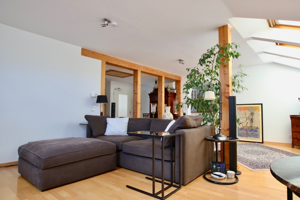 Diese zauberhafte 3-Zimmer-Altbauwohnung im Frankfurter Trendviertel Nordend bietet eine besondere Atmosphäre inmitten der Großstadt Frankfurt. Sie liegt im dritten Stock eines für die Gegend typischen Stilaltbaus. Der Besucher erreicht die hochwertig ausgestattete Wohnung über eine geschwungene Holztreppe mit eisernem Handlauf. Durch die Eingangstür eröffnet sich ihm der Blick in den großzügigen und hellen Wohnbereich mit Holzbalken, die zum Teil als Raumteiler oder Regale genutzt werden können.