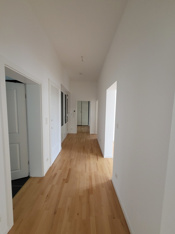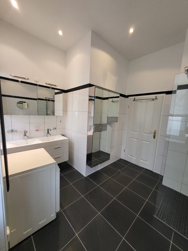 Das Tageslichtbad bietet mit seiner Ausstattung eine Dusche und ein Bidet. Jenes ist schwarz/weiß und erstrahlt tagsüber ebenfalls in natürlichem Licht. Zusätzlich wird die Dusche abgesenkt und sorgt somit für einen angenehmen Zugang. Der Flur dieses Objektes verbindet jeden einzelnen Raum.